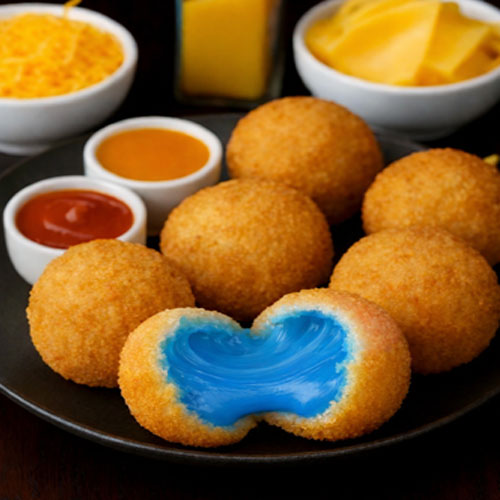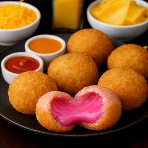 見た目も楽しい、味も本格派。「4色チーズボール」は、カラフルな衣と、とろ〜り伸びるチーズが魅力の、SNS映え間違いなしの人気商品です。