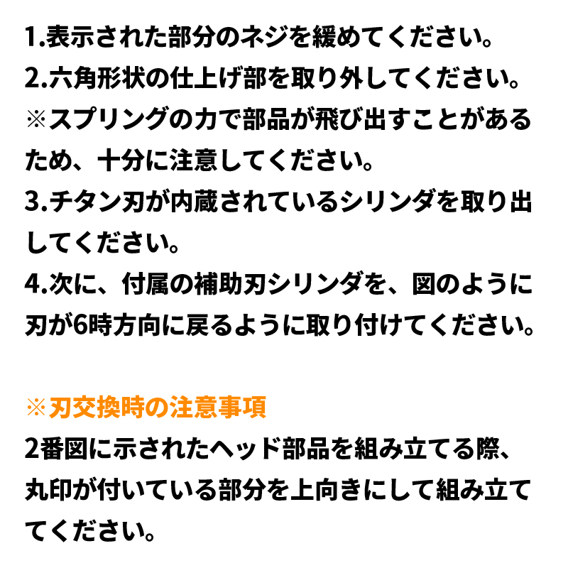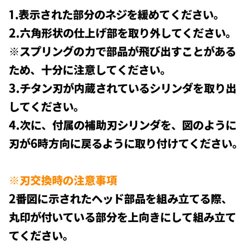 <注意事項>※本製品は対応モデル専用です。適合機種をご確認ください。※刃は非常に鋭利です。交換時は必ず手袋を着用してください。※お子様の手の届かない場所で保管してください。※分解・改造は事故や故障の原因となります。